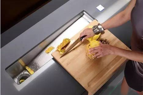 水槽是個整合的垃圾處理裝置,水槽采用了傾斜設(shè)計,垃圾會沿著斜坡下沉。另外,這個水槽還采用了靈活的觸摸技術(shù),清洗周期由固定不變的藍(lán)光顯示,垃圾處理周期由閃爍的藍(lán)光顯示。